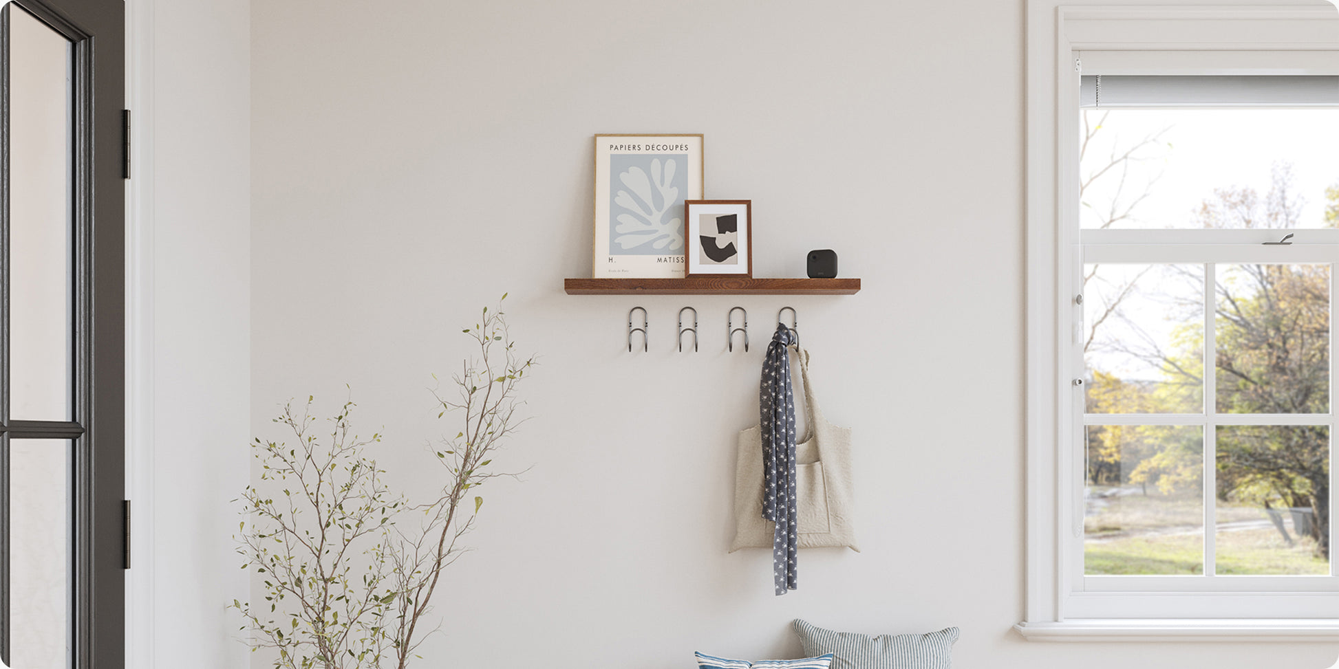 Blink Outdoor 4 est placée sur une étagère dans l'entrée d'une maison et se fond parfaitement avec le décor environnant aux tons neutres.